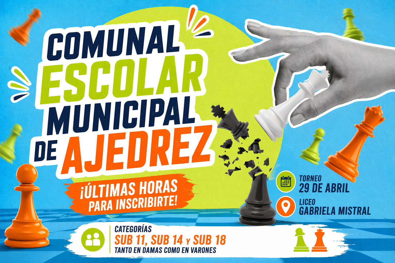 La inteligencia, la paciencia y la capacidad de análisis se tomarán el Liceo Gabriela Mistral este miércoles 29 de abril. El establecimiento será la sede del Campeonato Comunal Escolar Municipal de Ajedrez, una instancia deportiva y recreativa que convoca a estudiantes de toda la comuna en las categorías Sub 11, Sub 14 y Sub 18, tanto en damas como en varones.